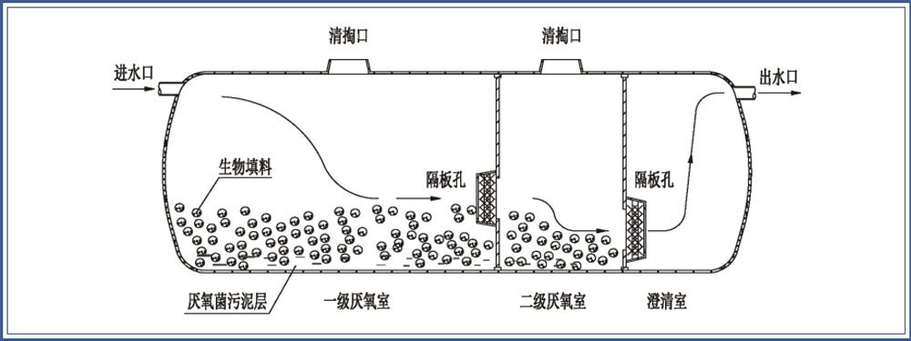 许多人只知道它的外形与众不同,看起来似一个空筒的罐体,其实玻璃钢化粪池的内部并不是完全空心,玻璃钢化粪池的内部结构也是非常有讲究的,里面包含着许多特别的设计结构:池内用隔仓板分成一级厌氧沉淀池、二级厌氧生化沉淀池和澄清池三部分,两隔板于不同高度的位置设计有隔板孔,沉淀池内填充有高效生物厌氧处理填料和挂膜填料: