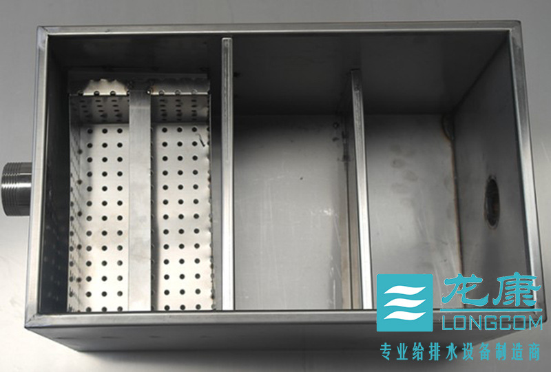 3、第三处理区:在第三处理间,水流水质得到稳定,浮油得到进一步的去除。同时,污水进入设有除渣孔的不锈钢过滤板进一步过滤去除细小渣滓(主要悬浮颗粒),从其下端的各个孔入口自下而上进入第四处理隔间——排放区,此时使水流缓缓流出。