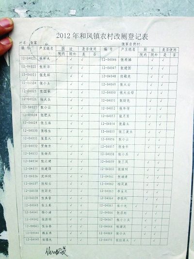 “2012年和凤镇农村改厕登记表”,社区负责人签了字却“一问三不知”。