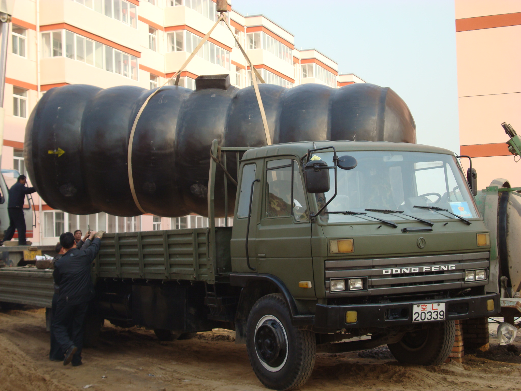 2、用起重机和软绳索将玻璃钢储罐吊起,放在地面上事先备好的木板上,比较小的玻璃钢储罐也可将叉车的前叉包上软垫,用叉车将玻璃钢罐放置在木板上,所有玻璃钢罐都应避免罐体及配件直接与地面接触。